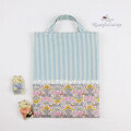 リバティ風小花生地とブルーストライプ生地の上品な2段切り替え、レースをあしらってオシャレに飾りました。
