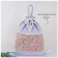 持ち手付き大きめ巾着袋大【LL】(お着替え袋 体操服入れ)40×35cm(ポケット付・お着替え袋)とお揃いの入園入学グッズ 手作り【幼稚園・保育園】女の子の綿麻の花柄&パープル ~入園入学グッズセット商品(裏付)です。