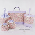 幼稚園・保育園・小学校の入園入学グッズ、に女の子のおしゃれなレッスンバッグ・お着替え袋、体操服入れ(体操着)巾着袋などセットで準備させていただいております。