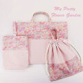 幼稚園・保育園・小学校の入園入学グッズ、に女の子用の可愛い!小花柄のレッスンバッグ・お着替え袋、体操服入れ(体操着)巾着袋などセットでご用意させていただいております。