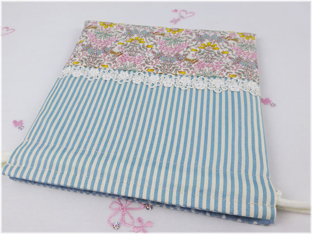 リバティ風小花生地とブルーストライプ生地の上品な2段切り替え、レースをあしらってオシャレに飾りました。