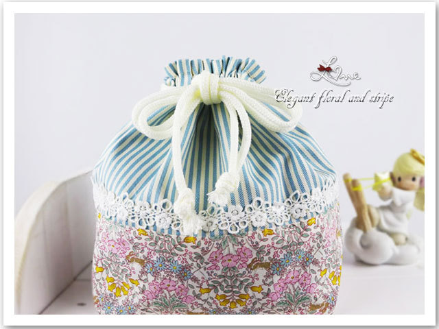 お弁当箱入れ(女の子):巾着袋とお揃いの入園グッズ・通園グッズ 手作り(ハンドメイド)の上品なリバティ風 小花~入学入園グッズ セット商品(裏付)です。♪♪