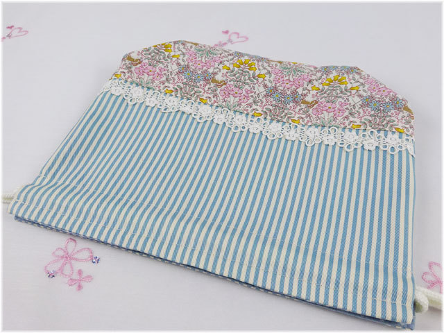 リバティ風小花生地とブルーストライプ生地の上品な2段切り替え、レースをあしらってオシャレに飾りました。