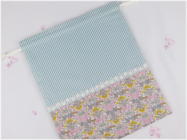リバティ風小花生地とブルーストライプ生地の上品な2段切り替え、レースをあしらってオシャレに飾りました。