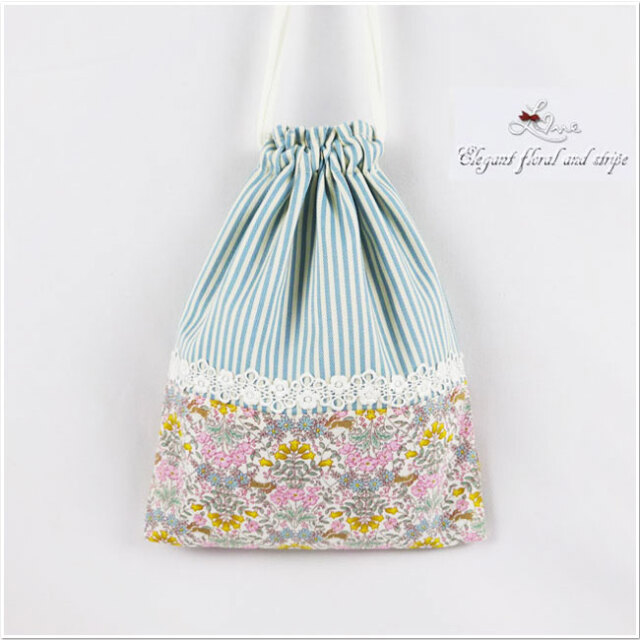 給食袋:大きめ巾着袋25×20とお揃いの通園・入園グッズ 手作り(ハンドメイド)の上品なリバティ風 小花~入学入園グッズ セット商品(裏付)です。♪♪