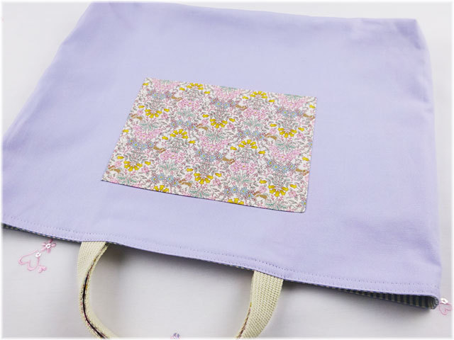 レッスンバッグの持ち手は耐久性を高めるためにアクリルテープに小花生地を縫い付けています。