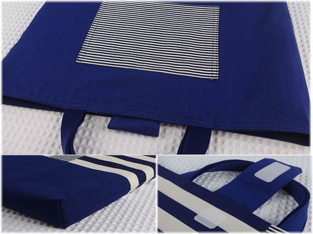 入園グッズ 手作り(ハンドメイド)蓋つき手提げ大きなレッスンバッグフラップ付き(通園バッグ)32×43cm、ボーダー デザイン 紺色(コン)お揃いのおしゃれ デザイン 男の子・女の子 入園入学グッズ セット商品(裏付)です。