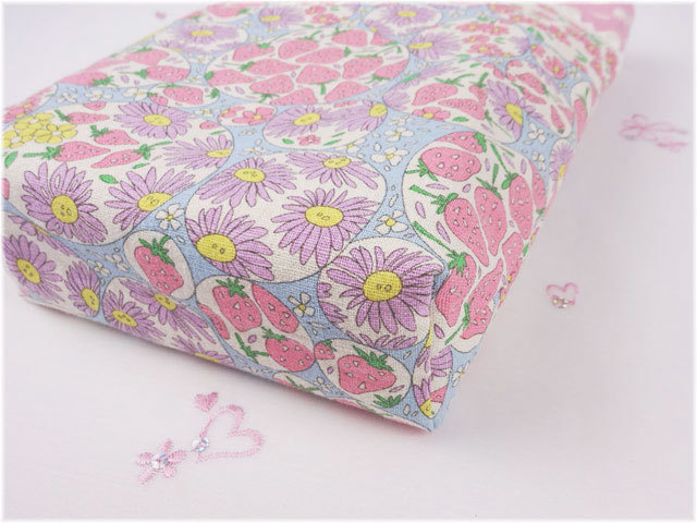 入手困難なYUWA商店スラブ洗いリネンの、イチゴとお花がいちめんに広がった大小のシャボン柄と、人気の大粒水玉ドット柄にレースを飾って組み合わせています。