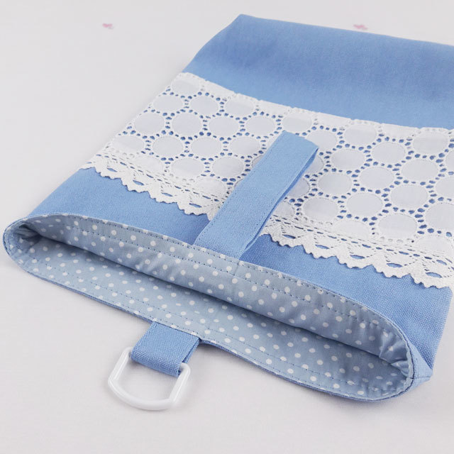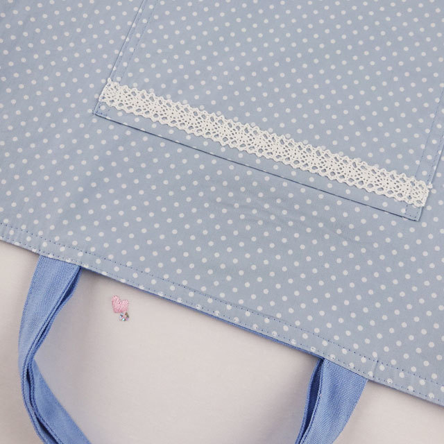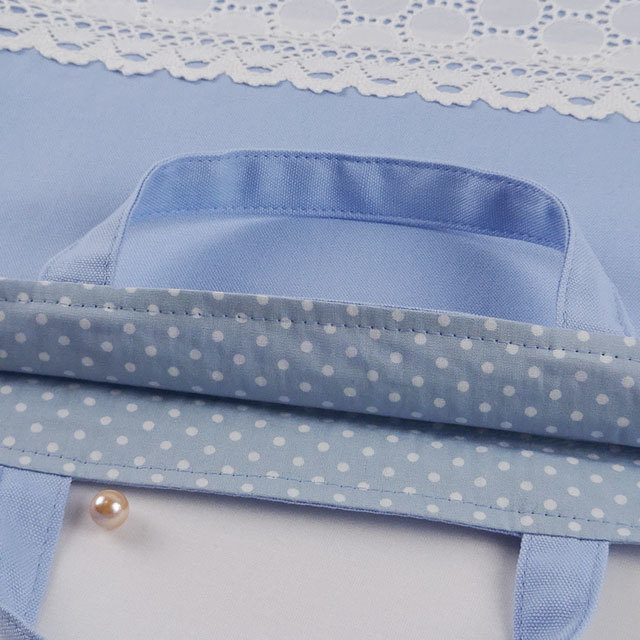 巾着袋はブルーのオックス生地にレース生地を縫い付け、レースで飾りました。