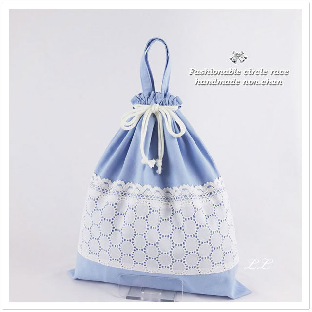 持ち手付き大きめ巾着袋大【LL】(お着替え袋 体操服入れ)40×35cm(ポケット付・お着替え袋)とお揃いの入園入学グッズ 手作り【幼稚園・保育園】女の子用のサークルレースの刺繍 ~入園入学グッズセット商品(裏付)です。