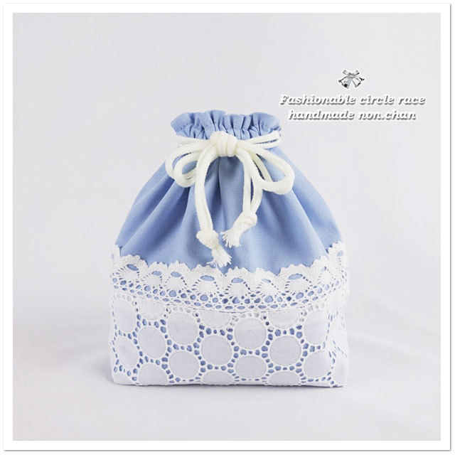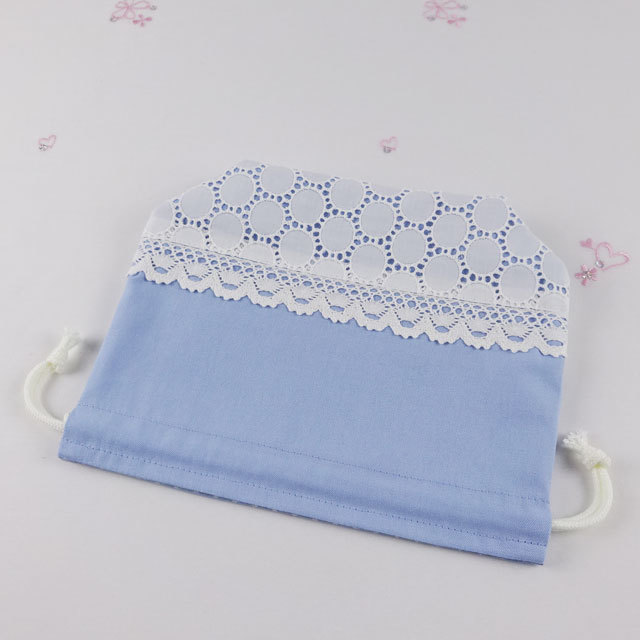 巾着袋はブルーのオックス生地にレース生地を縫い付け、レースで飾りました。