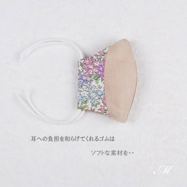 リネンとリバティ(トム)生地を組み合わせ、お顔のラインに添う立体縫製でフィットしやすいデザインです。