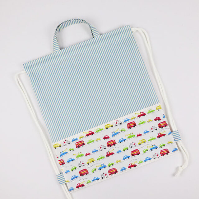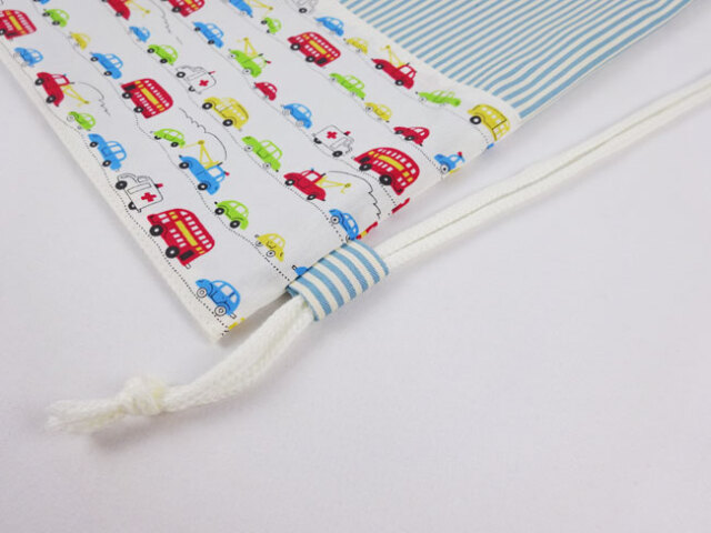 くるま・働く車柄のボーダーとブルーのストライプを組み合わせ、男の子用に和やかな柔らかい雰囲気にお作りをさせて頂きました。