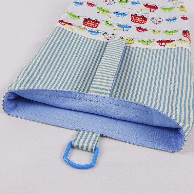 くるま・働く車柄のボーダーとブルーのストライプを組み合わせ、男の子用に和やかな柔らかい雰囲気にお作りをさせて頂きました。