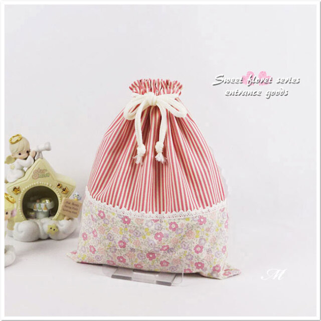 入園グッズ・入学グッズ(ハンドメイド)巾着袋【M】(体操服入れ お着替え袋)30×25cm女の子 小花ピンク リバティ風とお揃いの可愛いセット商品(裏付)です。