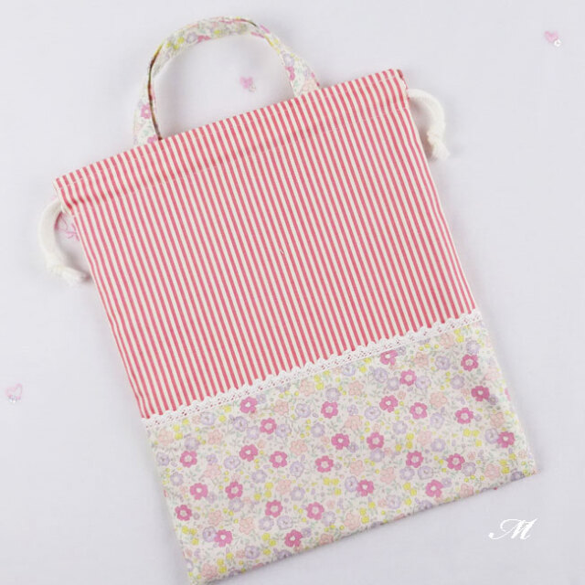入園グッズ・入学グッズ(ハンドメイド)持ち手付き巾着袋【M】(体操服入れ お着替え袋)30×25cm女の子 小花ピンク リバティ風とお揃いの可愛いセット商品(裏付)です。