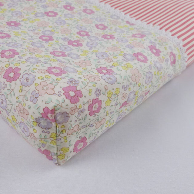 ピンク・パープル・黄色のリバティ風小花生地とオレンジかかったピンク系のストライプ生地の2段切り替え、レースをあしらって心もオシャレも弾み!さわやかな。。