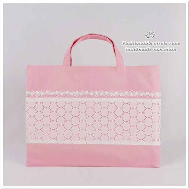 入園グッズ・入学グッズの手提げレッスンバッグ(通園バッグ)3点セットとお揃いの女の子のサークルレースの刺繍 手作りのセット商品(裏付)です。