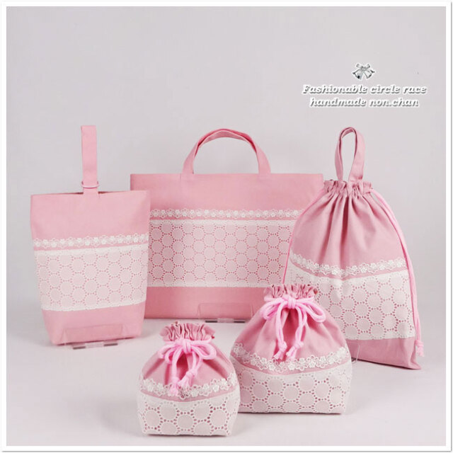 入園グッズ・入学グッズの手提げレッスンバッグ(通園バッグ)5点セットとお揃いの女の子のサークルレースの刺繍 手作りのセット商品(裏付)です。