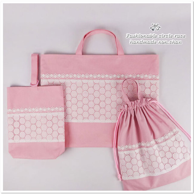 入園入学グッズの3点セット、手作りレッスンバッグ【大】(大きめ通園バッグ)縦35×横45×マチ5cmとお揃いの女の子のサークルレースの刺繍 セット商品(裏付)です。