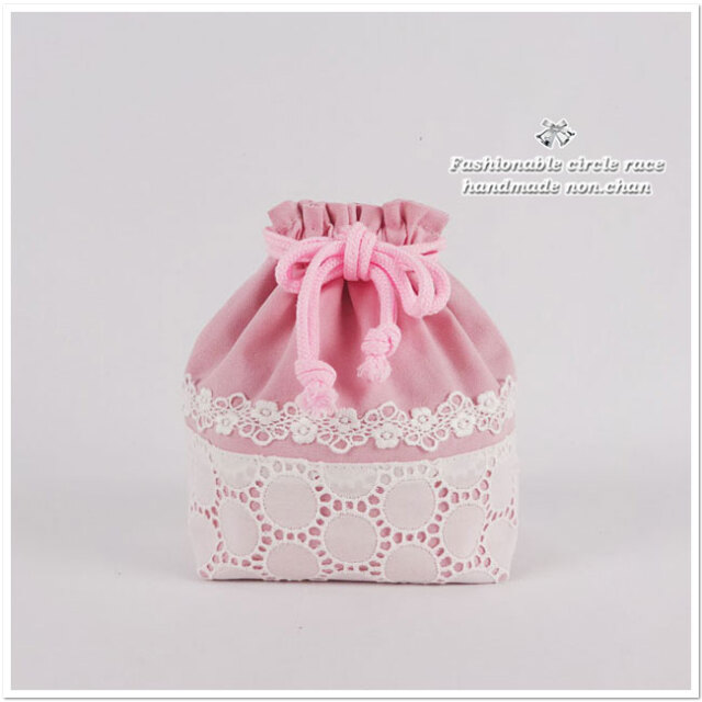 巾着袋はピンクのオックス生地にレース生地を縫い付け、レースで飾りました。