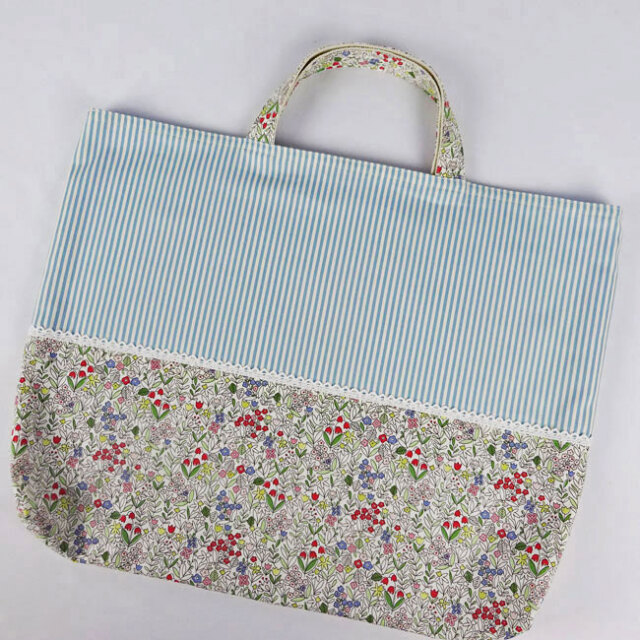 通園・入学グッズの手作りレッスンバッグ【大】(大きめ通園バッグ)35×45cmとお揃いのリバーシブル上品なリバティ風 小花、可愛い 入学入園グッズ セット商品(裏付)です。