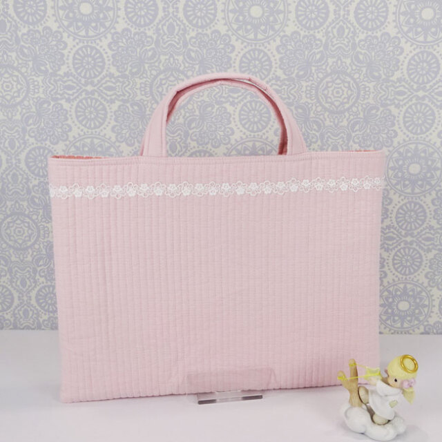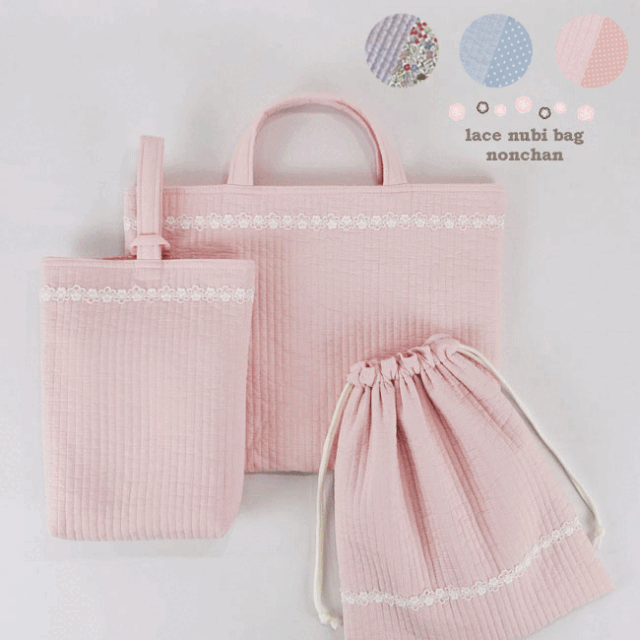 手提げレッスンバッグ3点セットとお揃いの入園・通園グッズ(ハンドメイド)女の子 イブル生地(ヌビ生地)(裏付)です。♪♪