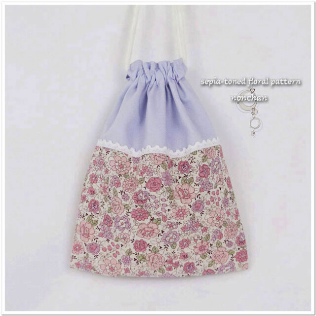 紫のオックス生地に、ナチュラルな風合いが魅力の綿麻の花柄生地を組み合わせ、レースでかわいらしくセピア風に仕上げました。