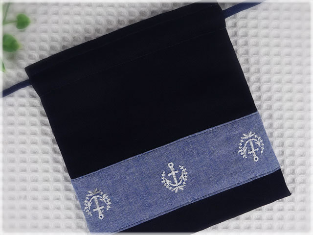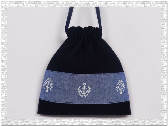 すがすがしい凛としたイメージのダンガリー素材マリン柄イカリ刺繍とグログラン生地ネイビー(コン)無地を組み合わせました。