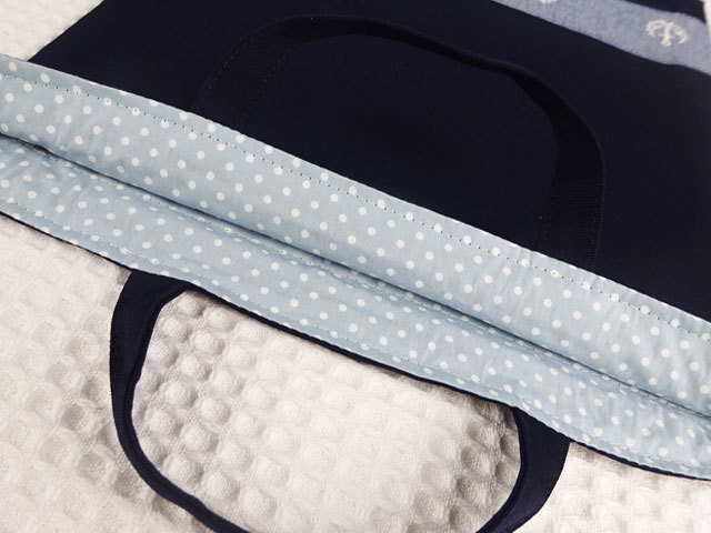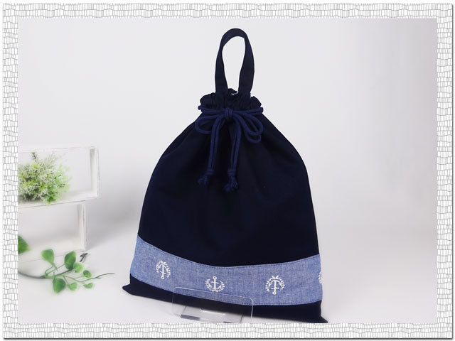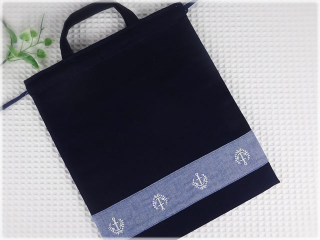 すがすがしい凛としたイメージのダンガリー素材マリン柄イカリ刺繍とグログラン生地ネイビー(コン)無地を組み合わせました。